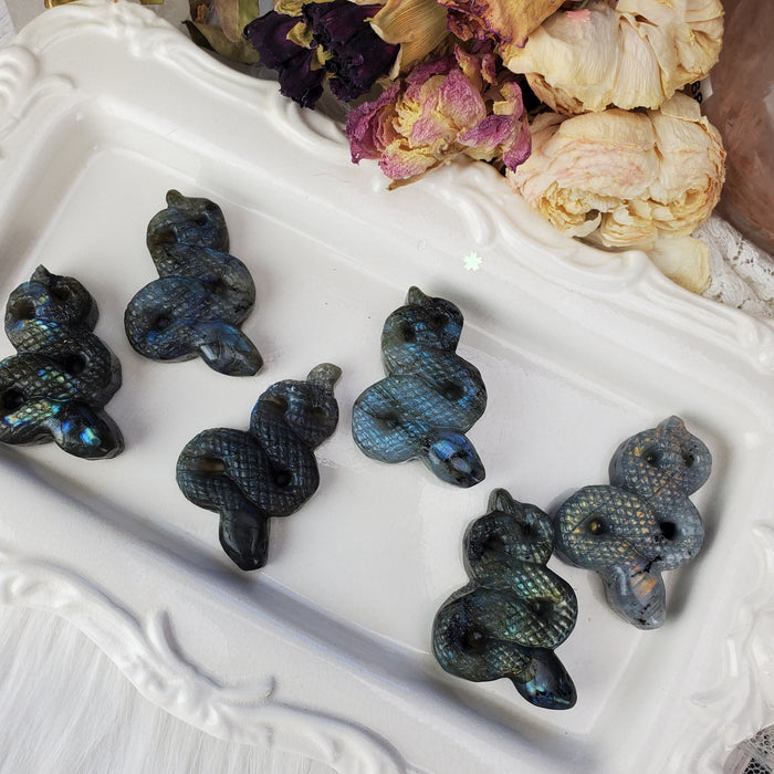 Slither and slink through the sky, these Snakes are full of Northern Light! These mythical Labradorite Snakes remind me of creature of lore. They are full of color!