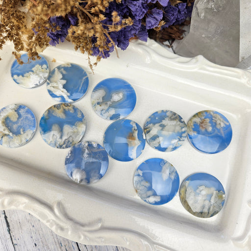 These Plume Agate and Resin Doublets remind me of bright blue skies and wispy cream colored clouds on a summer day. Our Summer Sky Cabochons are s...