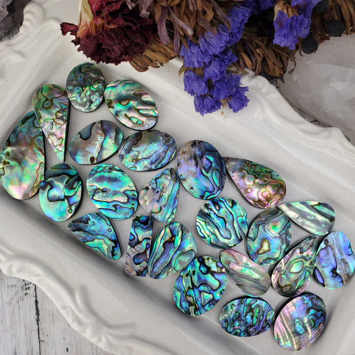 These Abalone Shell Cabochons are sold as randomly selected single pieces. They range from roughly 1/2''-1 1/2", are roughly 1/4" thick and are convex and uneven on top with a flat bottom.