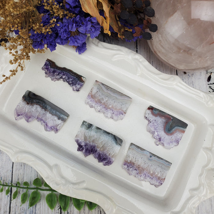 These Amethyst and/or Quartz with Agate Long Slices are sold as randomly selected single pieces. They are approximately 1x1 1/2", approximately 1/8-1/4" thick and are flat on top and bottom.