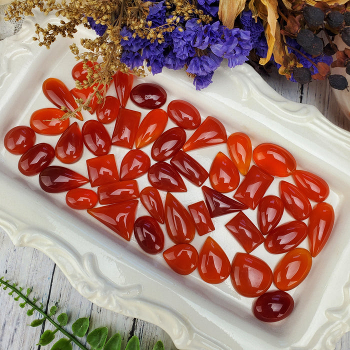 Our Orange Onyx Cabochons are sold as randomly selected single pieces. They range from approximately 5/8''  - 1 1/2" . They are flat backed with convex tops.