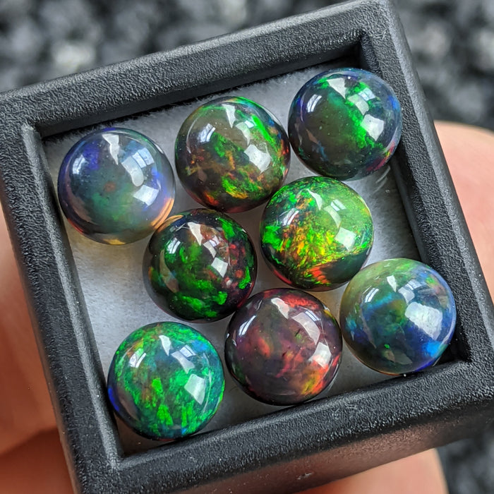 Our ~7mm Round Welo Smoked Black Opal Cabochons are hand cut and polished from Ethiopian Opal that has been 'smoked', a process that darkens the opals.
