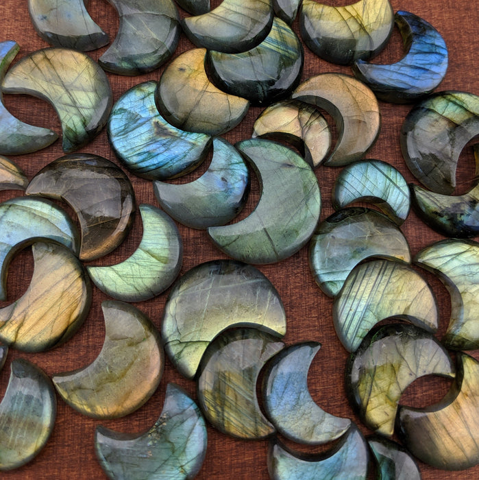 These Labradorite Crescent Moons are sold as randomly selected single pieces. They range from roughly 3/4-1 1/4", are roughly 1/4" thick and are convex on top with a flat bottom.
