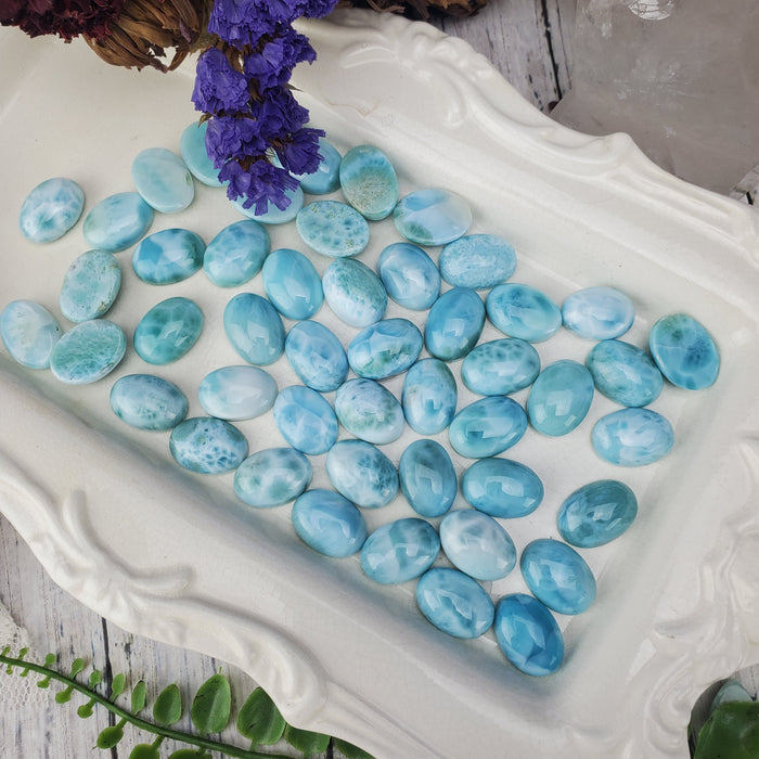 Our Larimar Cabochons are sold as randomly selected single pieces. They are approximately 13 x 18mm. They are flat backed with convex tops.