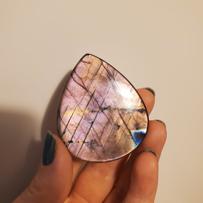 This big and flashy Labradorite is soft purple with a brilliant orange undertone.