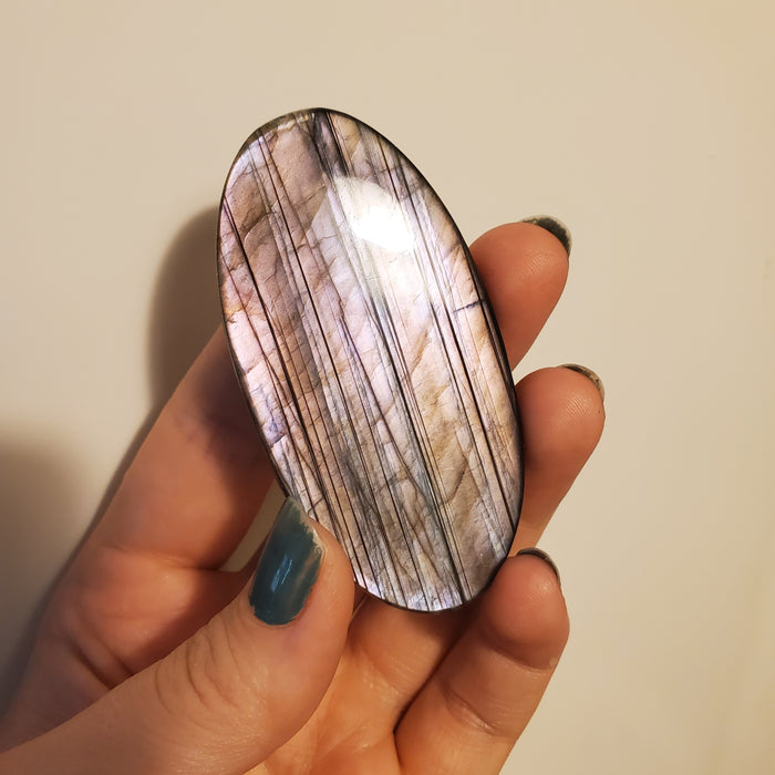 This big and flashy Labradorite is soft mauve with a brilliant orange undertone.