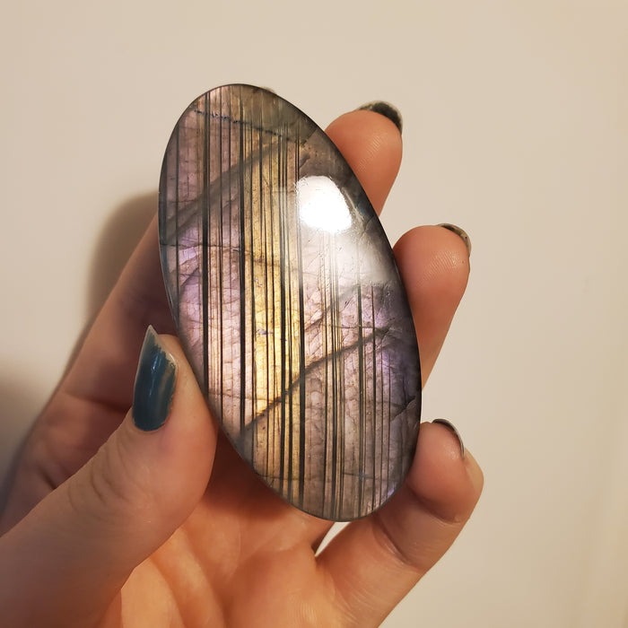 This big and flashy Labradorite is soft mauve with bright purple and striking gold.