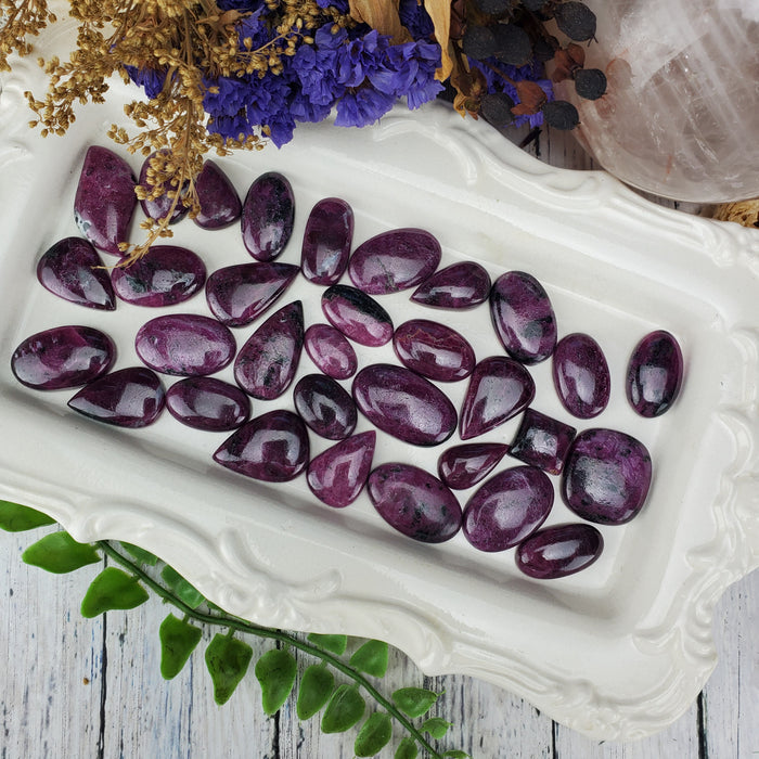 Our Ruby Cabochons are sold as randomly selected single pieces. They range from approximately 3/8" - 1 1/2". They are flat backed with slightly convex tops,