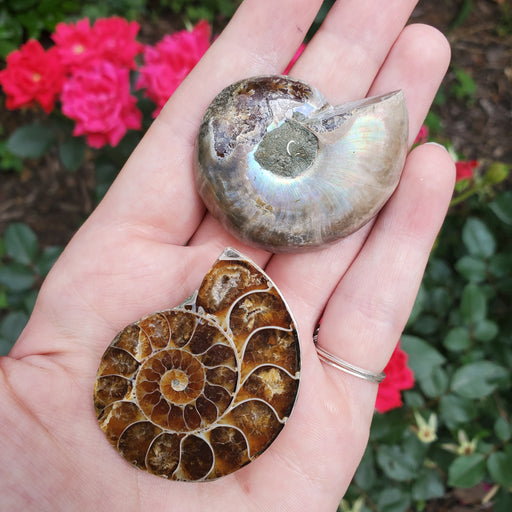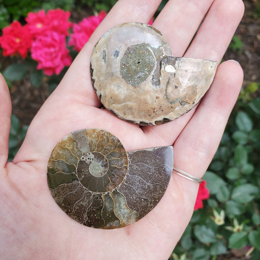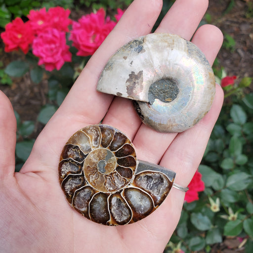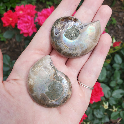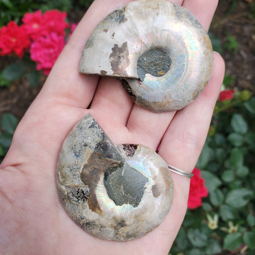 This beautifully preserved Ammonite Split shines, displaying rainbow light. This Ammonite Fossil is approximately 2" long and 1 1/2" wide. They a...