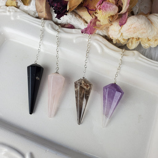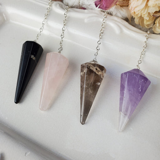 This is a beautiful and light capturing mix of Amethyst, Obsidian, Rose Quartz, and Smoky Quartz Pendulums. These pieces all feature small natural ...
