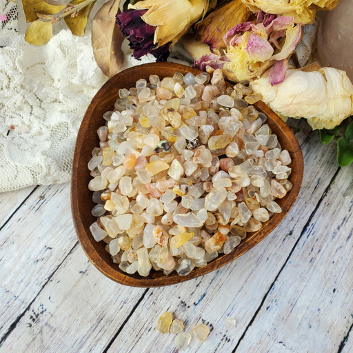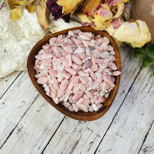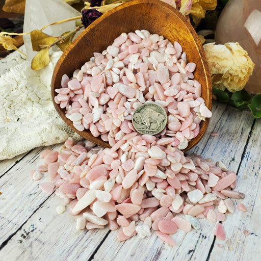 Our Pink Opal Chips are sold in randomly selected approximately 50 gram bags. They range from approximately 1/4''-5/8'' long. These are slightly tu...