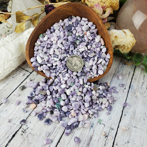 These Lepidolite Chips are sold in randomly selected 50 gram bags. They are approximately 1/8''-1/4'' long. They are slightly tumbled, irregularly ...