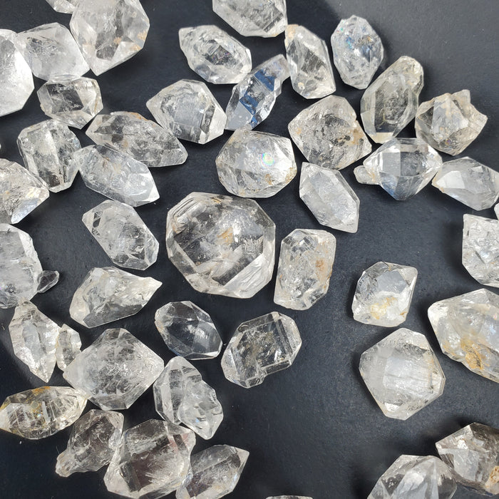 Our Pakimer Diamonds are sold as randomly selected single pieces. They are approximately 15mm- 25mm long. These are all natural Double Terminated Points. Many of these crystals have Petroleum inclusions! So they will glow under a black light.