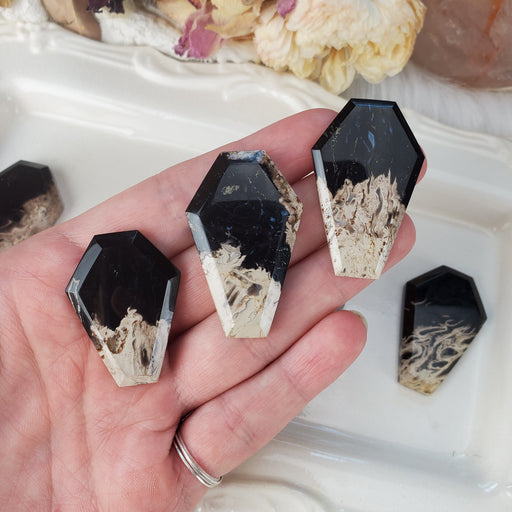 Our Fossil Palm Root Coffins are hand cut and polished from all natural Indonesian Fossil Palm Root. In this mix you will find an array of color, f...