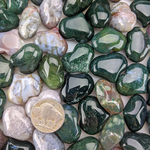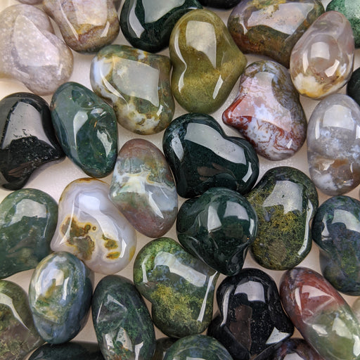 Our Moss Agate Puffy Hearts are hand cut and polished from all natural Moss Agate. These Moss Agate Puffy Hearts are sold as randomly selected sin...