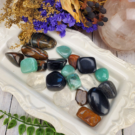 These Tumbles are sold as randomly selected 100g bags. There are roughly 8 - 12 pieces per bag. This is a mix of Aventurine, Obsidian, Tiger Eye, Q...