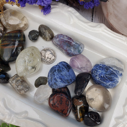 These Tumbles are sold in randomly selected 1/2 kilo lots. This is a mix of Aventurine, Obsidian, Tiger Eye, and Quartz. These Tumbles are fully p...