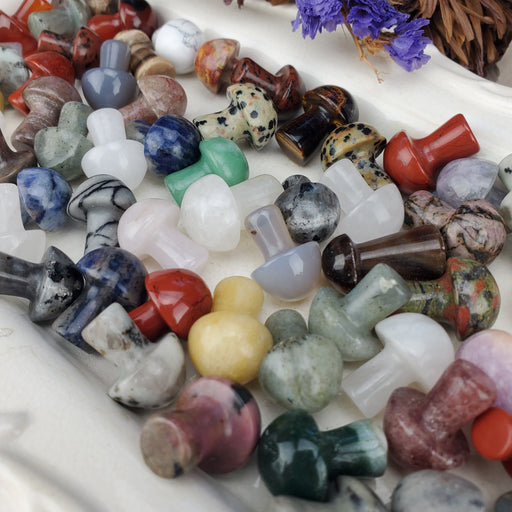 Unlock your inner forest fairy with these adorable Crystal Mushrooms! This is a huge mix of stones. You may find Amethyst, Flower Agate, Rose Quart...