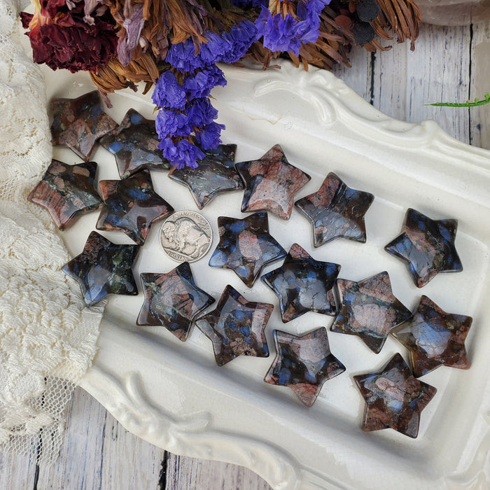 Our Ryolite Stars are sold as randomly selected single pieces. They are approximately 1 1/4''x1 1/4" and ¼" thick. They are slightly convex on top and bottom.