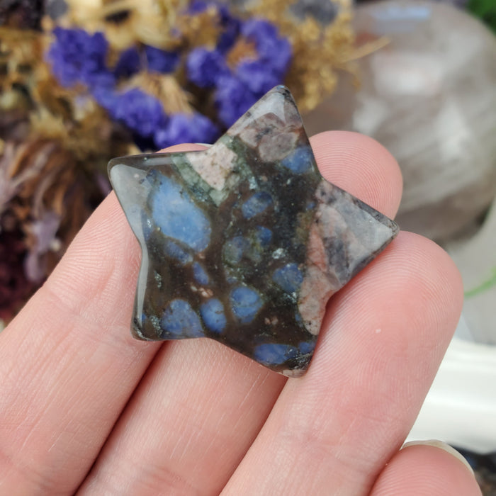 Ryolite, also known as Que Sera, has a unique composition and color! Formed from volcanic eruption, you'll find a variety of minerals including quartz, feldspar, kaolinite, iron oxides, magnetite, clinozoisite and leucozene. This stone has a dark matrix with bursts of blue and pale pink.
