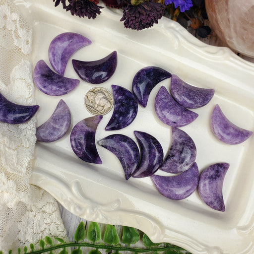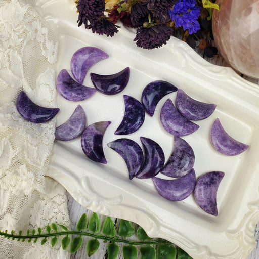 These mottled purple moons shine with soft tones that fade from light lilac to royal violet with little flecks of shining mica. Our Lepidolite Moo...