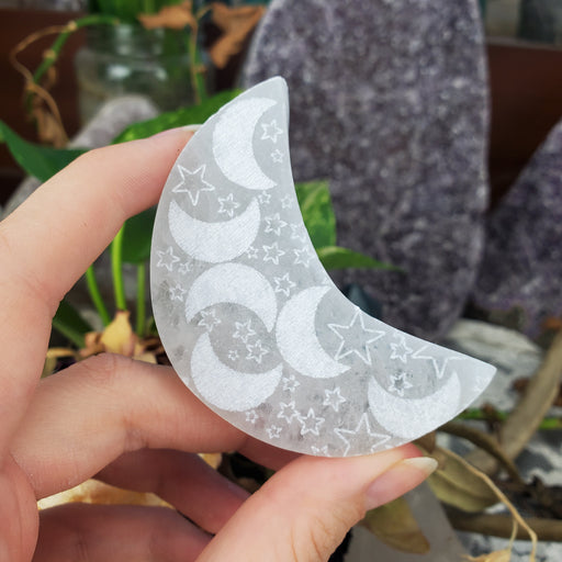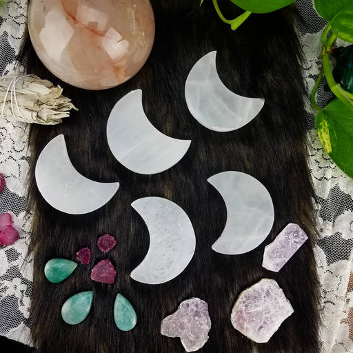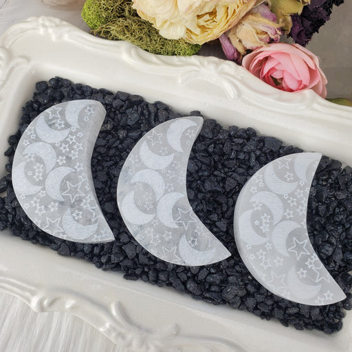 Our Selenite Moons are hand cut and polished from all natural Moroccan Satin Spar. Each moon is unique, luminous, and captivating. Their etched des...