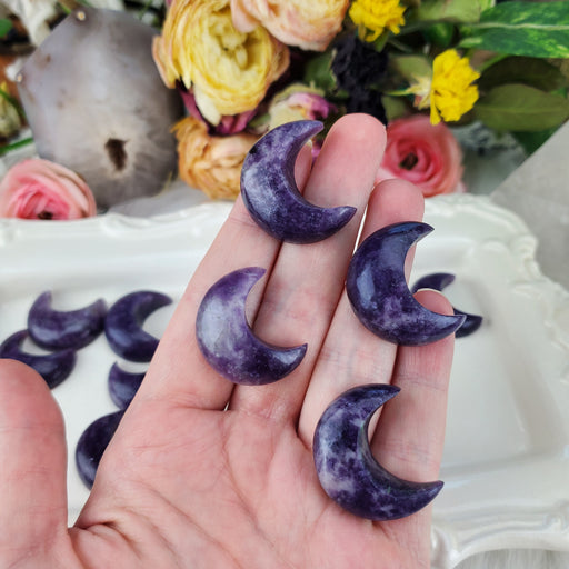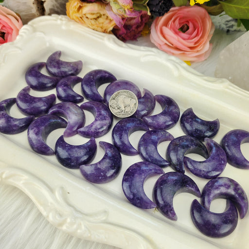 These mottled purple moons shine with soft tones that fade from light lilac to royal violet with little flecks of shining mica. Our Lepidolite Moo...