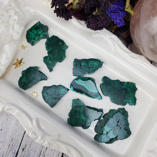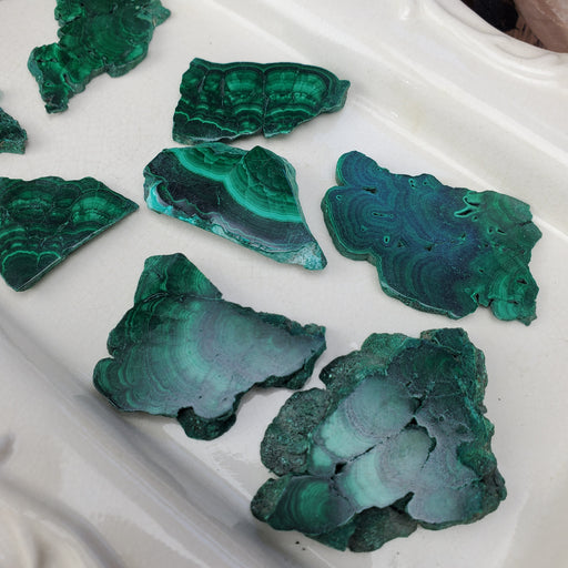 These Malachite Slices have lightly polished faces and raw edges. Because these pieces have raw edges, we encourage you to take proper precaution w...