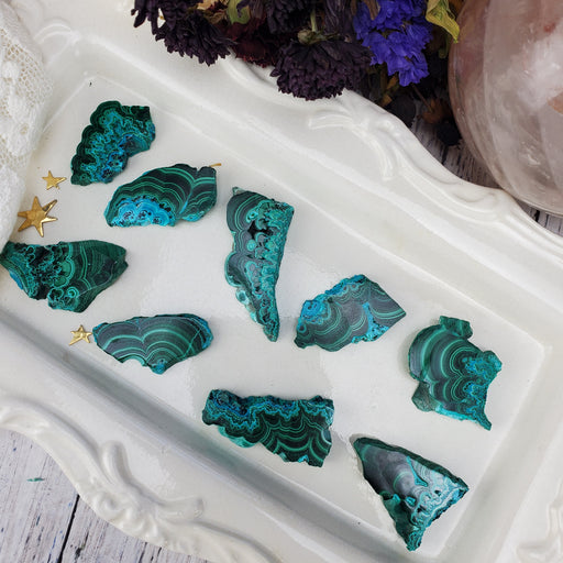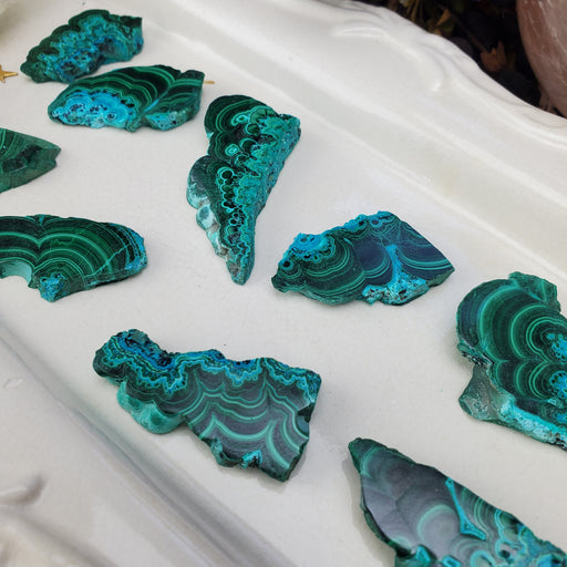 These Malachite Slices have lightly polished faces and raw edges. Their earthy forest green blended with an electric, other worldly, blue. Because ...