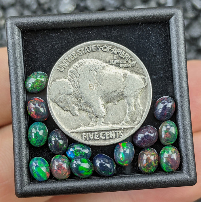 Our ~4x5mm Oval Welo Smoked Black Opal Cabochons are hand cut and polished from Ethiopian Opal that has been 'smoked', a process that darkens the opals.